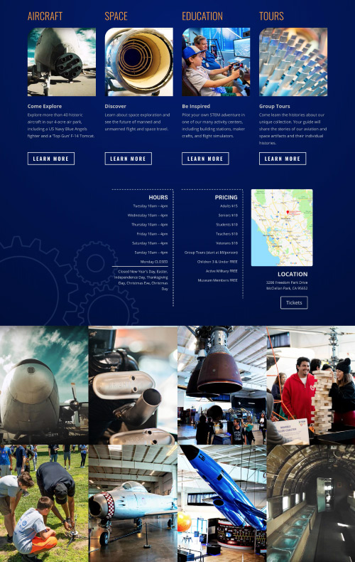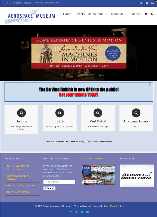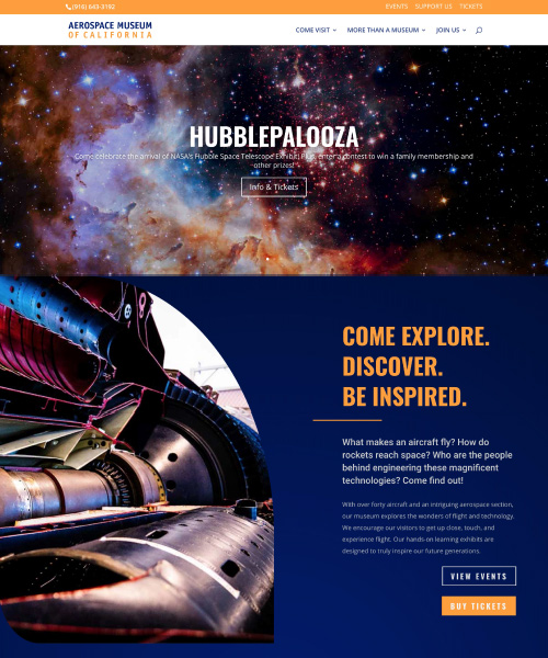 The main website as well as email newsletters are part of the Aerospace Museum of California's marketing and engagement efforts. This project was not just a website redesign, but a re-branding, creation of a new identity and additionally a new e-commerce website. All of the above was packaged with a solid strategy to help this non-profit museum streamline their operational costs and reach their audience more effectively. The client's biggest challenges included not being able to get their message across in the way they wanted to, not being in control of updating content on their own website, and an inability to display their events effectively.