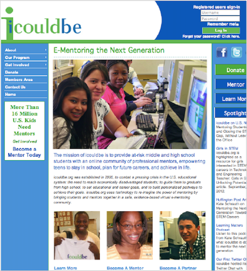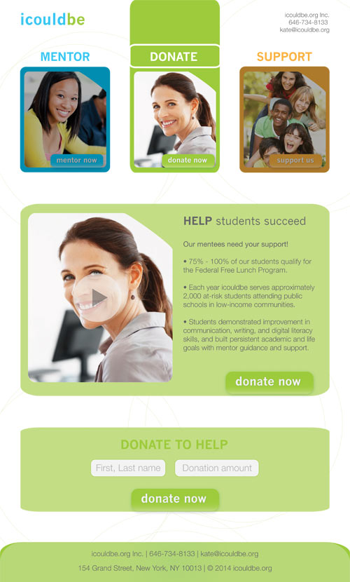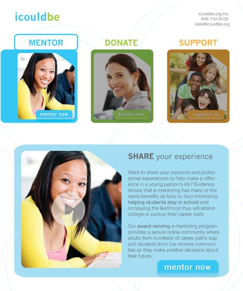 OBJECTIVE To redesign a website for nonprofit online mentor program, icouldbe.org. Interface should be responsive and resize to varying screen devices (desktop, tablet, mobile). The site should generate viewer interest and make it simple to become a mentor or sponsor.